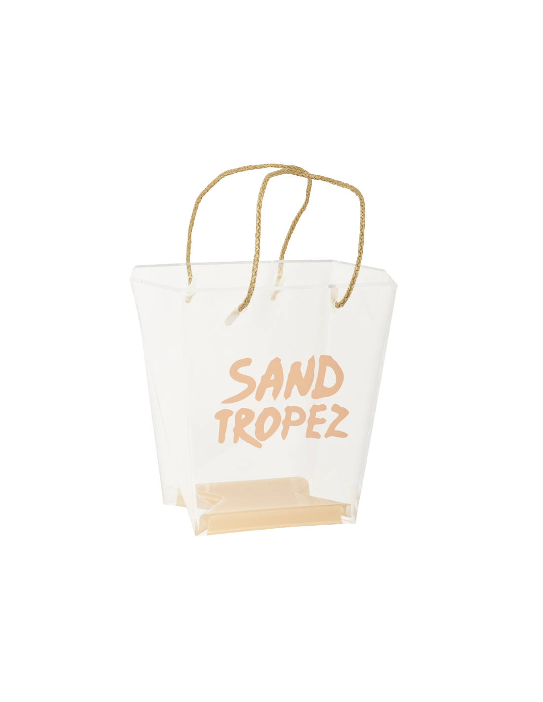 Transparence cristalline et lignes sobres soulignent la légèreté du design. Le logo Sand Tropez corail apporte une touche solaire et contemporaine, évoquant immédiatement l’esprit estival et la douceur des tables méditerranéennes.
